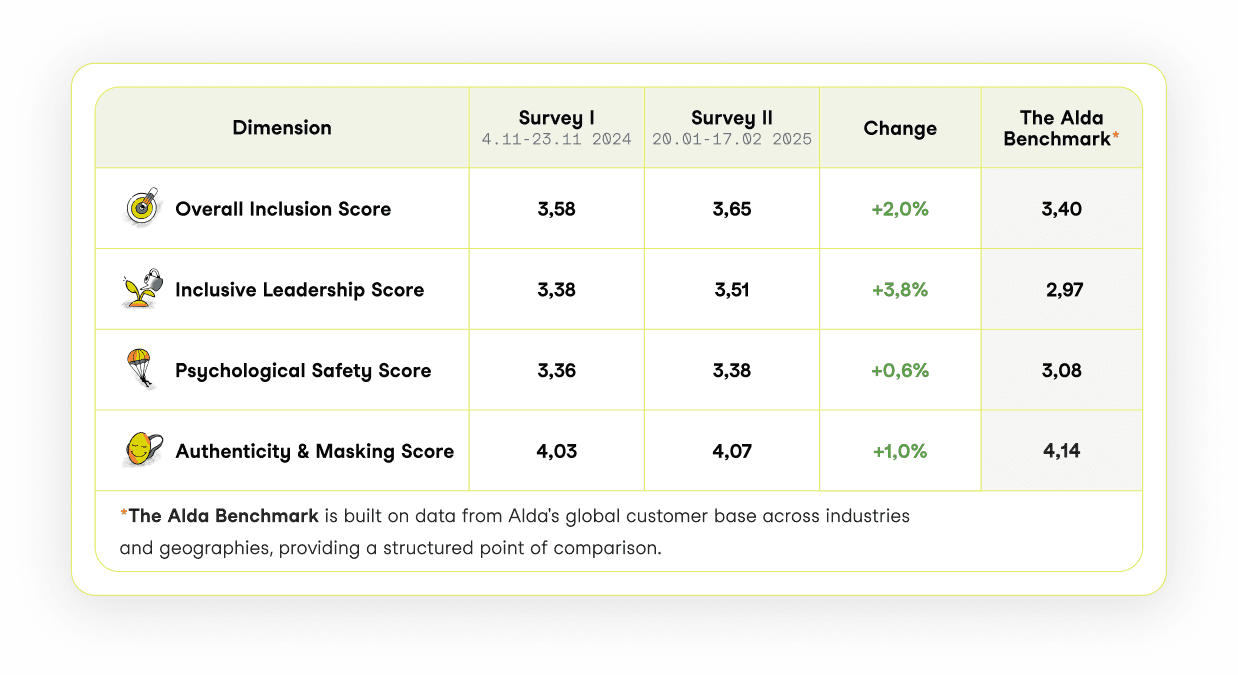 Aker Solutions improved across every inclusion dimension between the first and second culture survey, confirming that the model of measurement, targeted action, and repeated measurement is delivering results.
